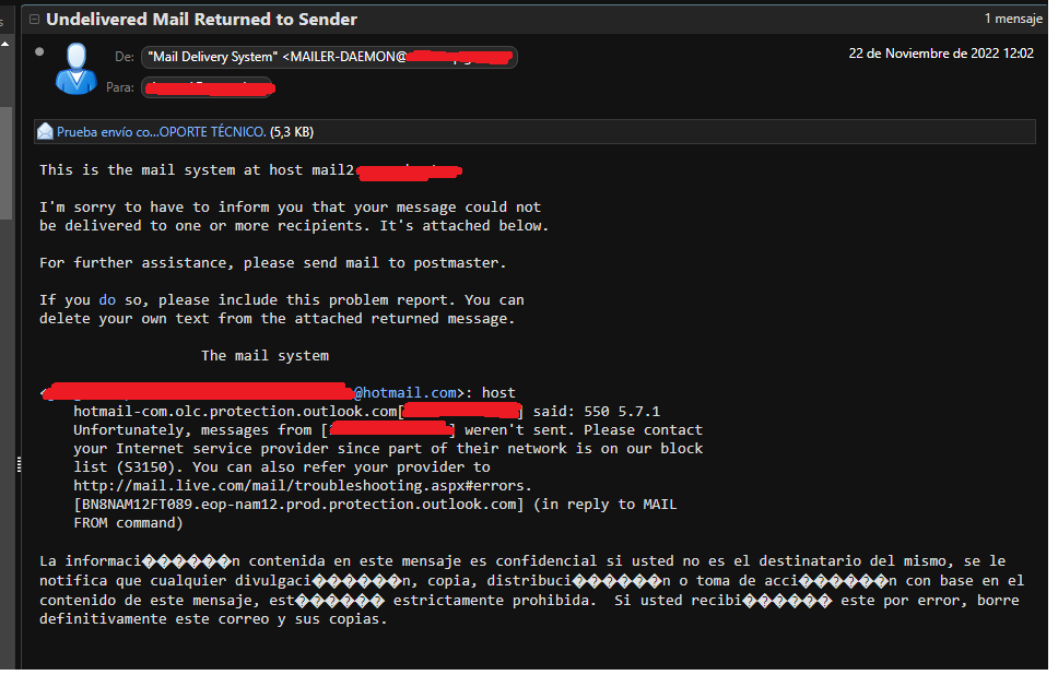 Como pie de página en este correo de rebote se menciona lo siguiente: que debe ser contactado al proveedor de servicios de internet ISP para que la IP pública (por seguridad aquí fueron cambiadas) sea retirada de la lista negra del dominio @outlook.com (que incluye @hotmail.com), sin embargo, esto no es correcto, dado que el ISP no es quien administra el dominio @outlook.com.