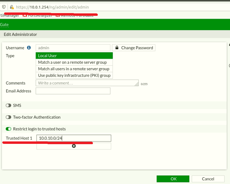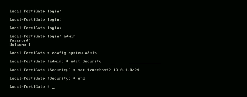 Local-Fortigate (Admin)# set trusthost2 0.0.0.0/0 (admitimos todas las redes, puede especificarse).