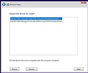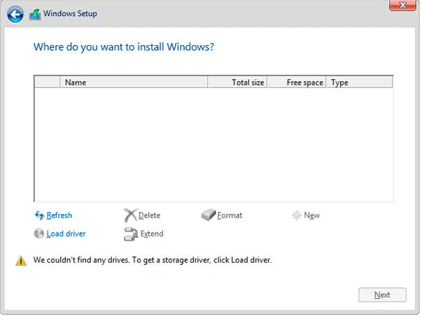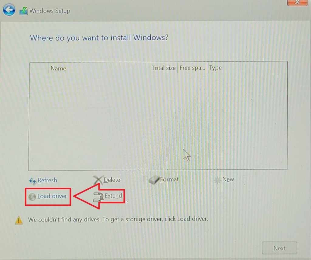 - Cuando estés en el proceso de seleccionar unidad de almacenamiento, abre la opción de [Cargar Controlador] / [Load Driver], como se ve en la imágen.